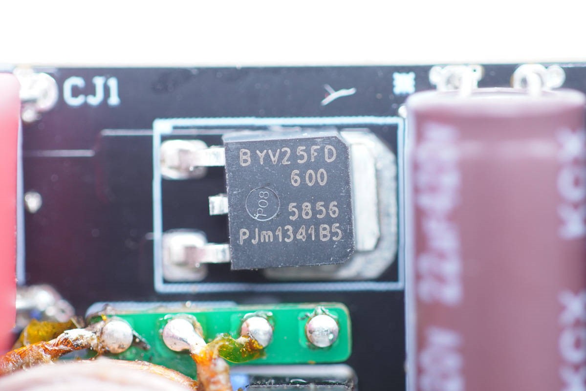 PFC升压整流器在板子正面,采用Repower BYV25FD-600,增强型超快功率二极管,耐压600V,额定电流5A。