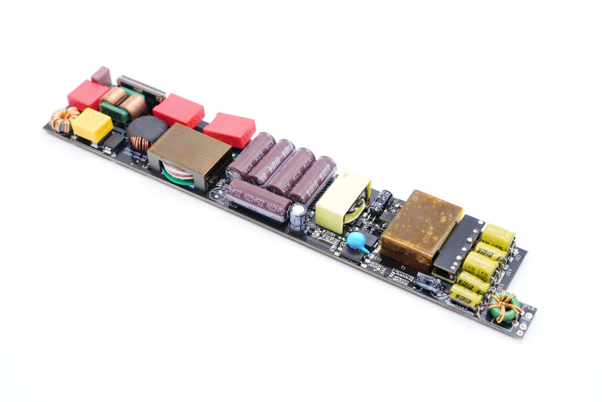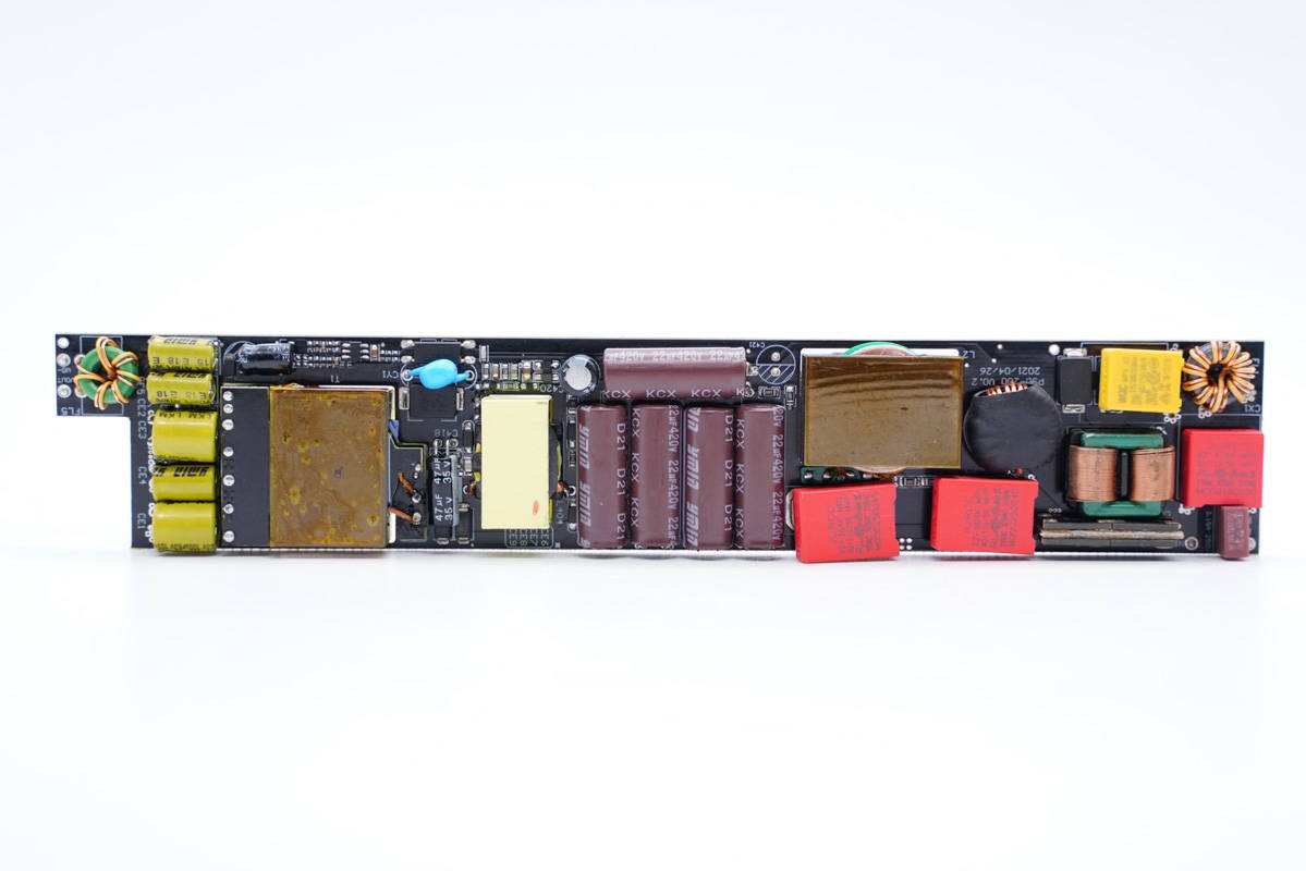 PCB正面包含滤波电容、变压器等元器件,具有完整的输入滤波电路结构。