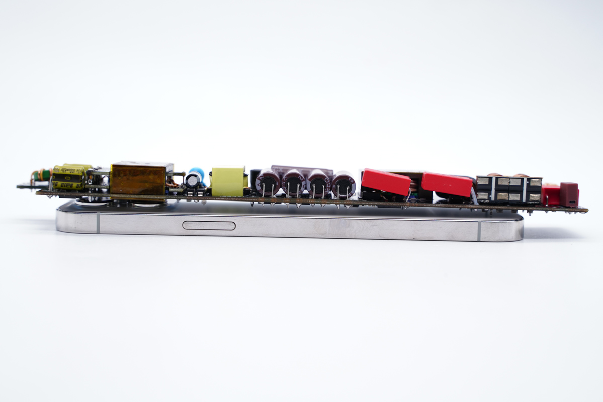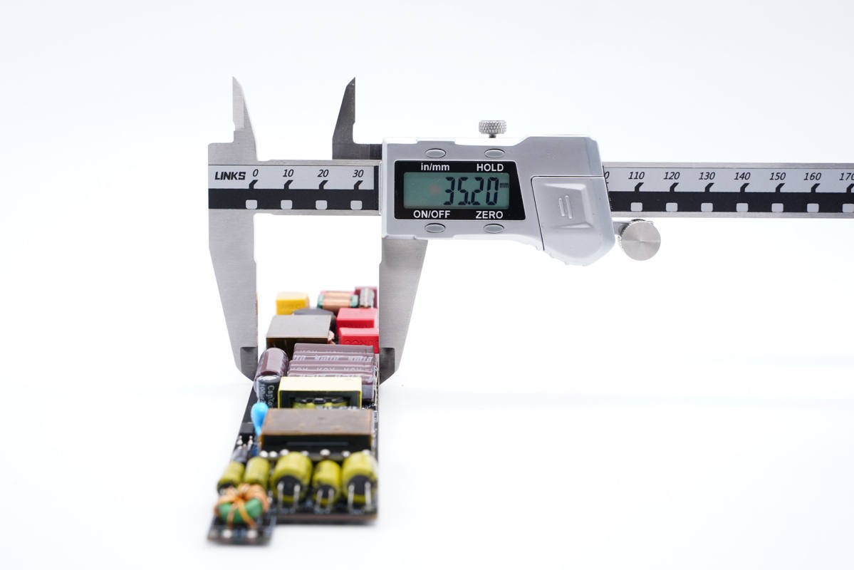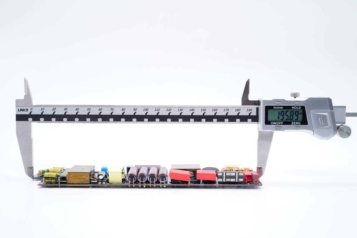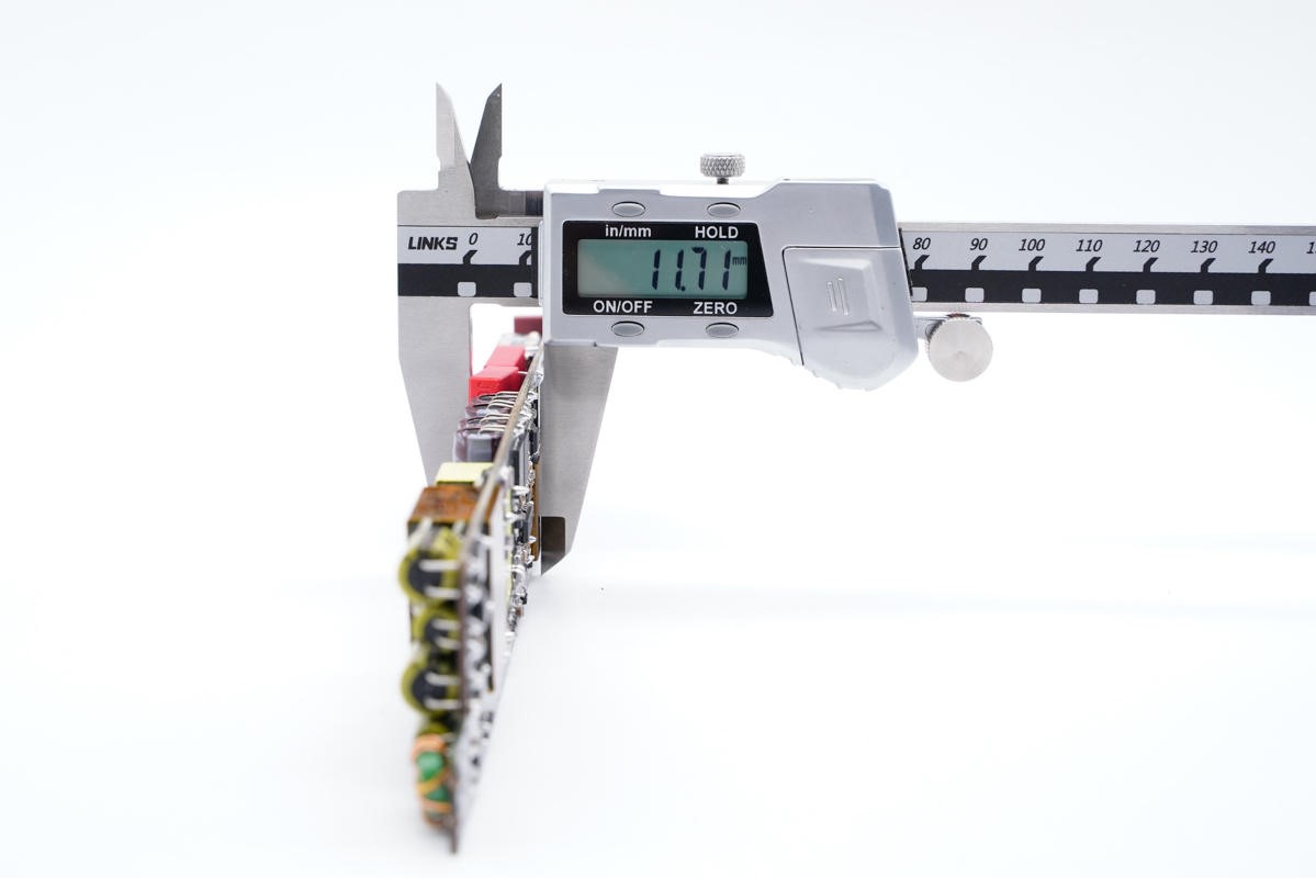厚度约为11.7mm,非常纤薄的电源设计。 计算出的功率密度约为 2.5W/CC。