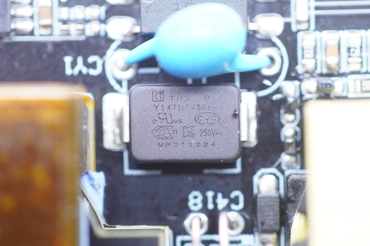 电源中的其中一个Y电容采用了TRX片式Y电容,相对于传统的插入式Y电容具有明显的高度优势。