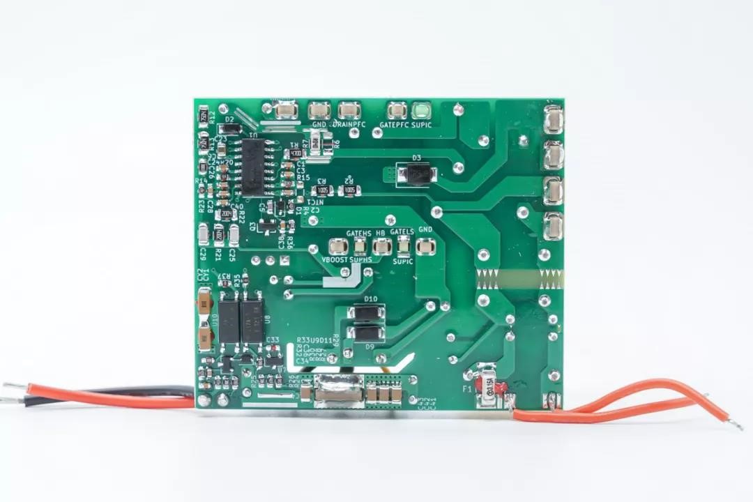 从正面看,四块小板与大板垂直焊接,增加可用板面积,提高空间利用率。 四块小板分别是有源桥式整流器、PFC晶体管开关、LLC晶体管开关和同步整流器,它们穿插在PFC升压转换器和LLC变压器之间。