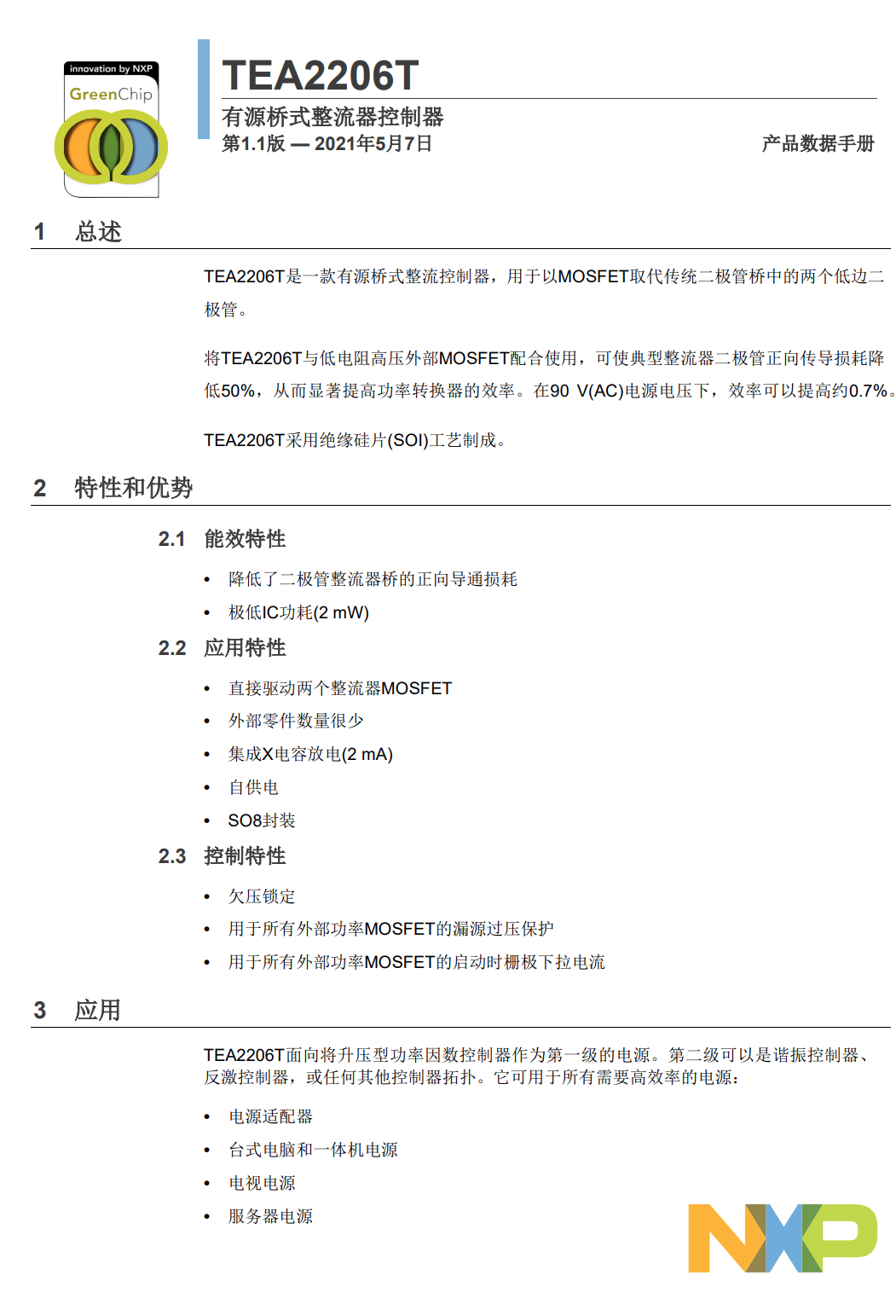 NXP 的 TEA2206T 是一款有源桥式整流控制器,用于用 MOSFET 替换传统二极管桥中的两个低侧二极管。 使用带有低欧姆高压外部 MOSFET 的 TEA2206T 可显着提高电源转换器的效率,因为典型的整流二极管正向传导损耗降低了 50%。