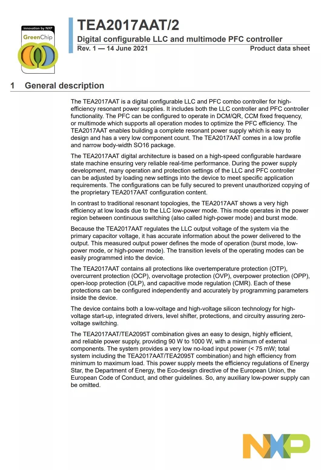 TEA2017AAT 是一款用于高效谐振电源的数字可配置 LLC 和 PFC 组合控制器。它包括 LLC 控制器和 PFC 控制器功能。 PFC 可以配置为在 DCM/QR、CCM 固定频率或支持所有操作模式的多模式下运行,以优化 PFC 效率。 TEA2017AAT 能够构建一个完整的谐振电源,该电源易于设计且组件数量非常少。 TEA2017AAT 采用薄型和窄体宽 SO16 封装。