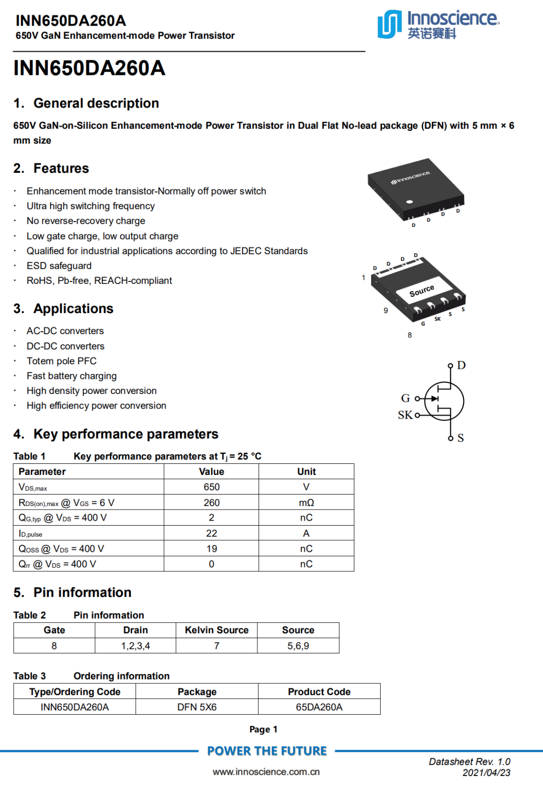 INN650DA260A 是一款耐压 650V 硅基氮化镓增强型功率晶体管,采用 DFN5*6 封装,瞬态电压高达 800V。 支持超高开关频率,无反向恢复电荷,极低的栅极电荷和输出电荷。 它符合 JEDEC 标准的工业应用,配备内置 ESD 保护,并符合 RoHS、无铅、欧盟 REACH 法规。