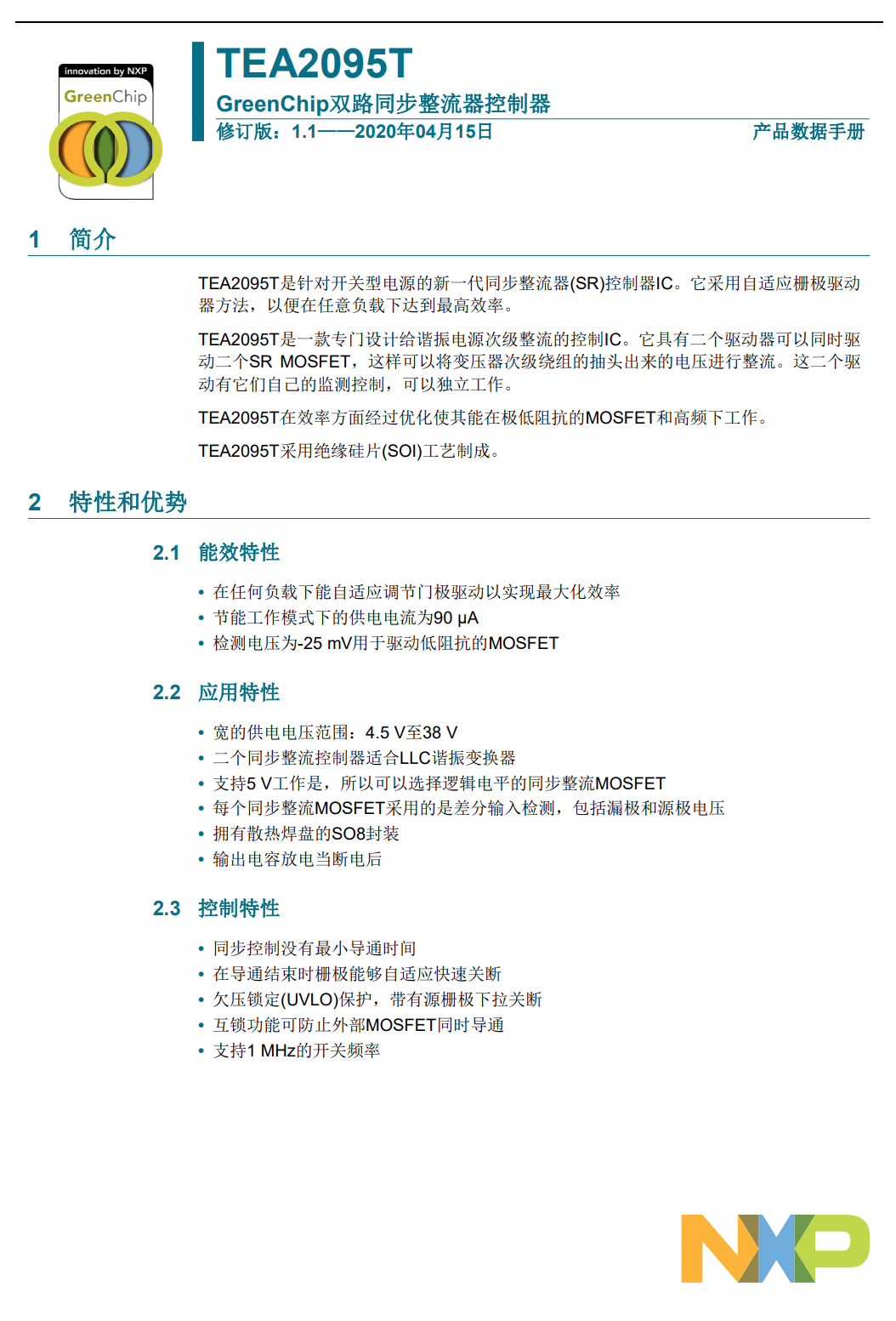 TEA2095T/TE 是一款用于开关模式电源的高性能同步整流器 (SR) 控制器 IC。同步整流器控制器采用自适应栅极驱动器技术,可在任何负载下最大限度地节省能源并提高轻载效率。 TEA2095T/TE 可在 90 μA 时在 -25 mV 的稳压电平下运行,这与具有低导通电阻的 MOSFET 完美配合。