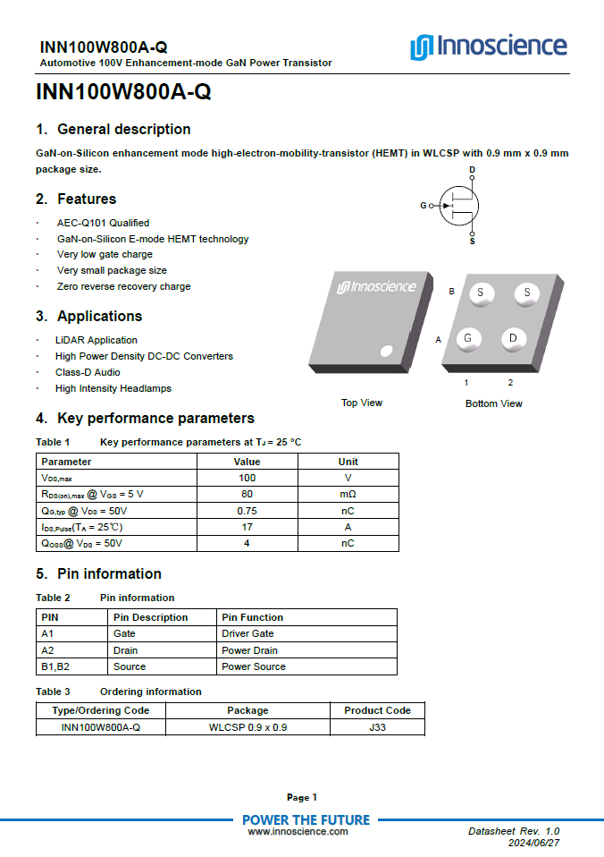 2023年底,英诺赛科已推出适用于自动驾驶激光雷达系统的100V车规级氮化镓芯片 INN100W135A-Q(AEC-Q101认证),目前已在多个终端客户中导入设计。为了满足应用多样化的需求,英诺赛科基于100V技术平台研发了一款更小封装体积的(WLCSP 0.9mm x 0.9mm )100V车规级氮化镓芯片INN100W800A-Q,延续低导阻、低栅极电荷、低开关损耗以及降低的反向恢复电荷等特性,并通过AEC-Q101 认证。
