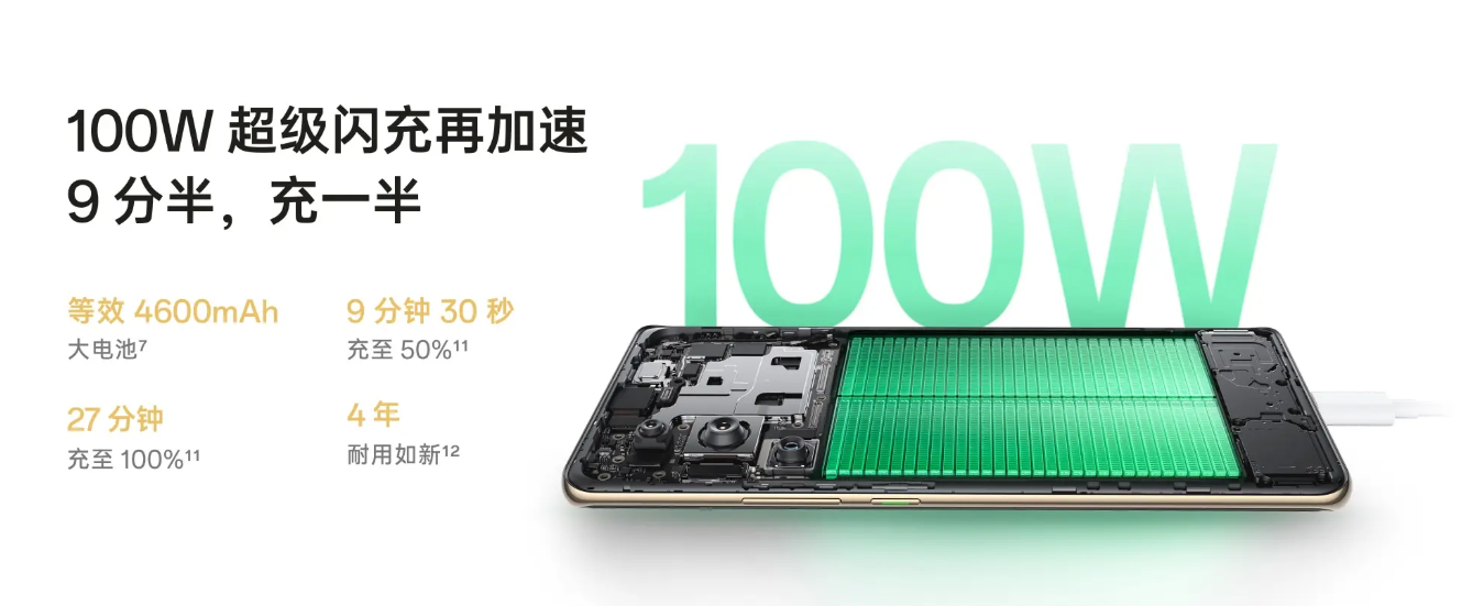 Simultaneously, thanks to the direct driving of the internal VGaN by OPPO's self-developed SUPERVOOC S power management chip, 45% of the fast-charging component area is saved. This supports 80W/100W SUPERVOOC flash charging, significantly enhancing battery life and fast-charging speed. It enables a seamless experience: 5 minutes of charging for 3 hours of streaming, or a full charge in just 27 minutes.
