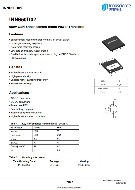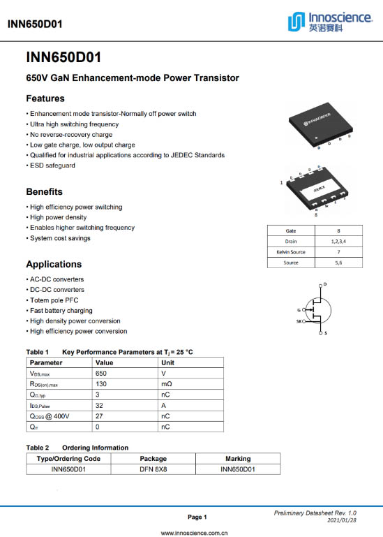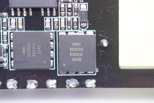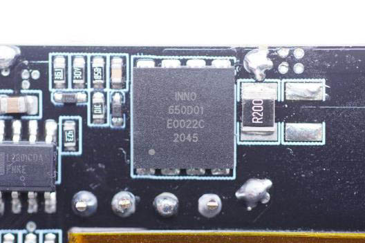 The PFC transistor is the Innoscience INN650D01, a GaN transistor with 650V of withstand voltage, 750V of transient withstand voltage, and 130mΩ of conduction resistance. The use of GaN transistor in PFC can reduce switching losses and minimizes conduction losses.