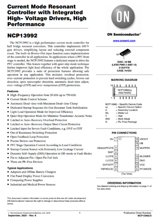 The LLC controller is ON Semiconductor’s NCP13992, a high-performance current-mode controller for half-bridge resonant converters. This controller has a built-in 600V gate driver, which simplifies the layout and reduces the number of external components. In applications requiring a PFC pre-amplifier, the NCP13992 can output a drive signal to control the PFC controller.