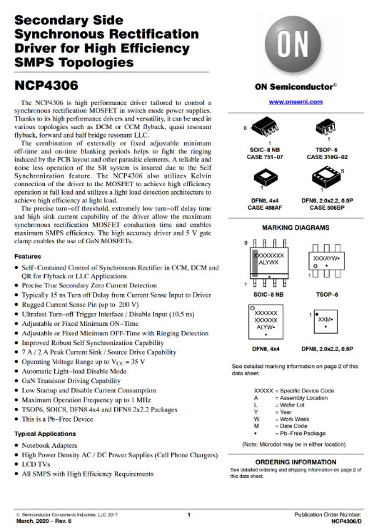 Due to the high-frequency LLC and the high energy efficiency requirements, this power supply uses the output uses synchronous rectifiers instead of Schottky diodes to improve efficiency and reduce heat generation. The synchronous rectifier controller is the NCP4306 for LLC synchronous rectification control.