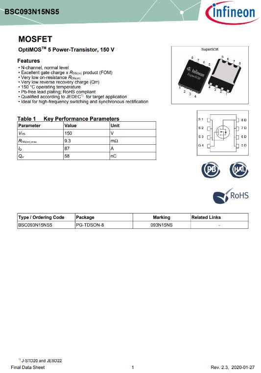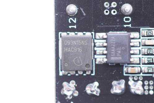 The synchronous rectifier uses Infineon’s BSC093N15NS with 150V of withstanding voltage, 9.3mΩ of conduction resistance, and 15mΩ of output current sample resistance on the right.