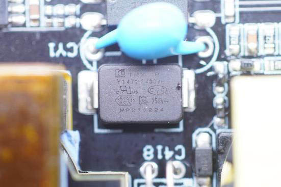 One of the Y capacitors in the power supply uses the TRX chip Y capacitor, which has an obvious height advantage over the traditional plug-in Y capacitors.