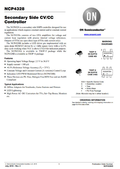 The output constant current control uses the ON Semiconductor NCP4328B for constant voltage and constant current control to provide constant current output for the LED power supply.