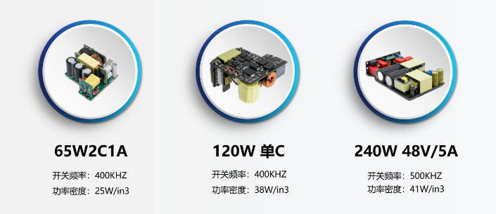 Among them, the 65W solution adopts the ACF+BUCK architecture, with power density of 25W/in3, and a size close to a traditional Si 30W fast charger.