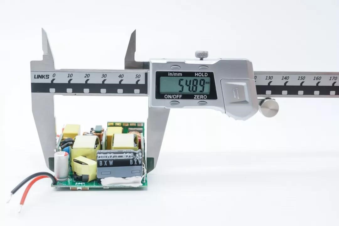 As seen from the front, four small boards are vertically welded to the large board to increase the available board area and improve space utilization. The four small boards are the active bridge rectifier, PFC transistor switch, LLC transistor switch and synchronous rectifier, which are interspersed between the PFC boost converter and the LLC transformer.