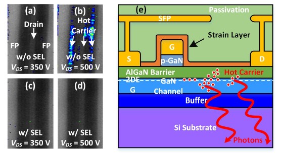 Hot carrier photoemission for device w/o SEL (a) 350 V, (b) 500 V, and w/ SEL (c) 350 V, (d) 500 V. (e) Device cross-section shows the hot carrier location and photoemission.