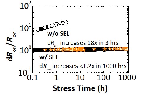 Comparison of dRon without and with the SEL under the hard switching test with Vds = 600 V, Vgs = 6 V, and fs = 100 kHz.