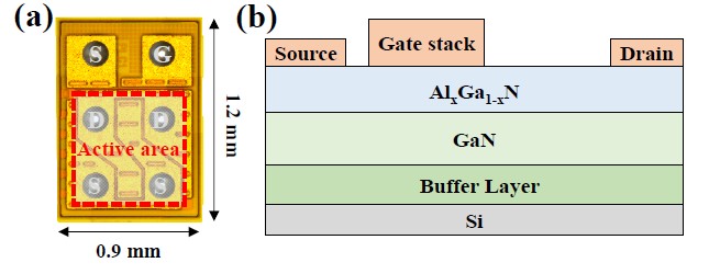 (a) Optical microscopy of the 15 V GaN HEMT in wafer-level chip-scale package (WLCSP) with few pH parasitic inductance. (b) Cross-section of the fabricated GaN HEMT.