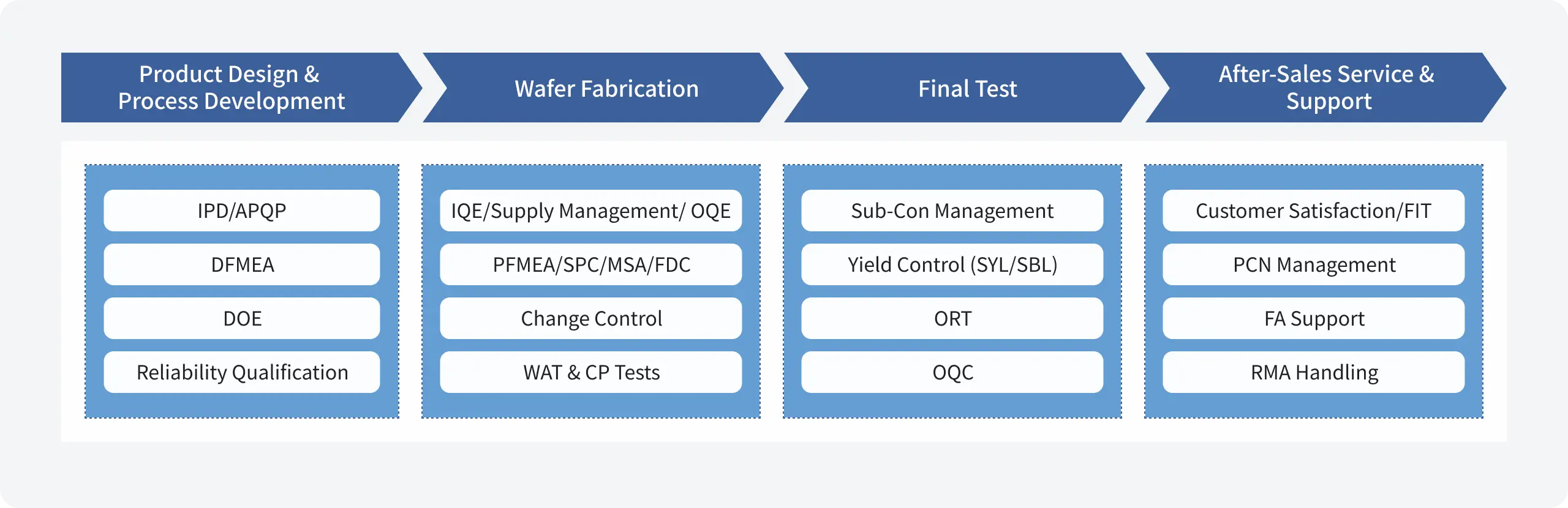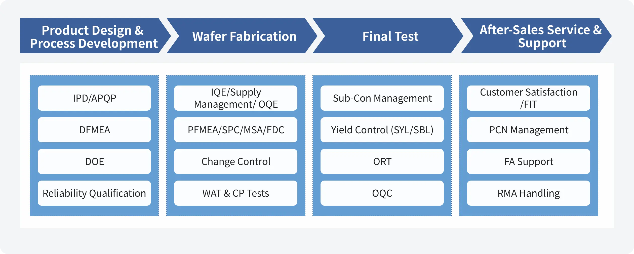 - Process QualityProcess QualityFocused on product competitiveness, we strictly control all activities in wafer fabrication that may impact product quality, ensuring that no defective products are produced or released.